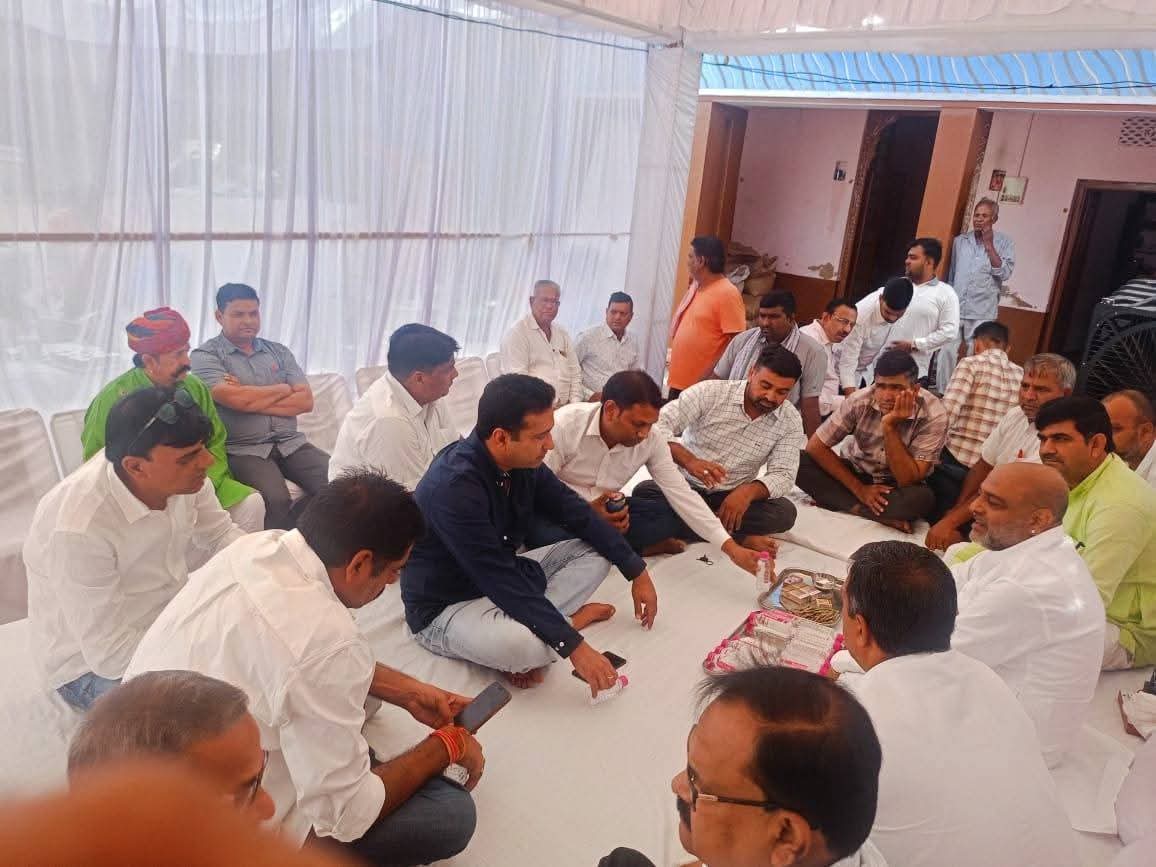 ग्राम शोभासर मे नारायण अग्रवाल के निवास स्थान पर शोक सभा मे उपस्थित चूरू सांसद व अन्य।