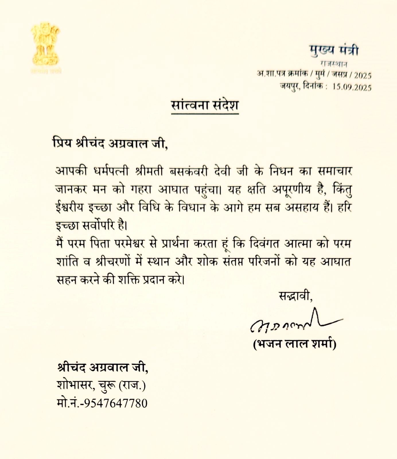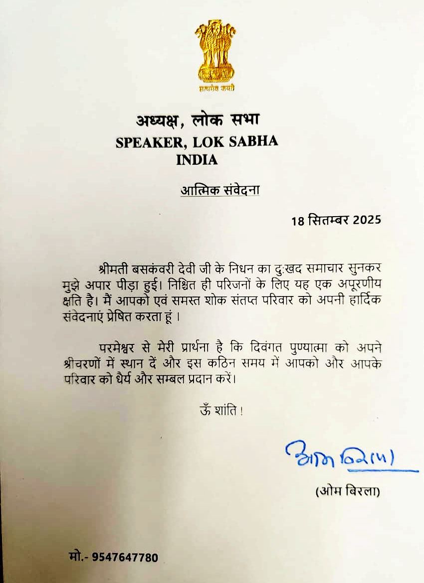 आपकी धर्मपत्नी श्रीमती बसकंवरी देवी जी के निधन का समाचार जानकर मन को गहरा आघात पहुचा। यह क्षति अपूरणीय है, किंतु ईश्वरीय इच्छा और विधि के विधान के आगे हम सब असहाय हैं। हरि इच्छा सर्वोपरि है। मैं परम पिता परमेश्वर से प्रार्थना करता हँू कि दिवंगत आत्मा को परम शांति व श्रीचरणों में स्थान और शोक संतप्त परिजनों को यह आघात सहन करने की शक्ति प्रदान करें।