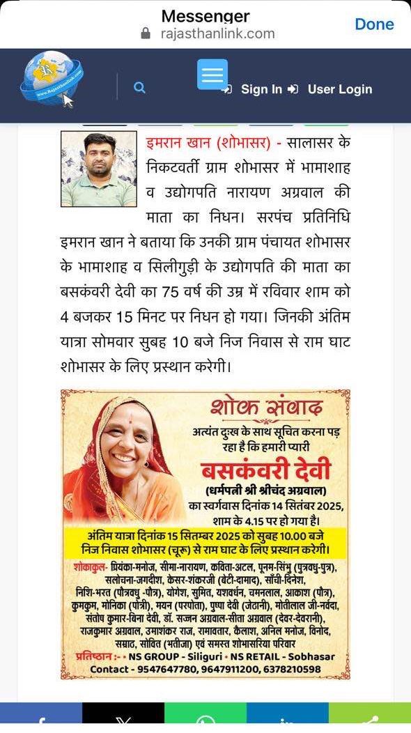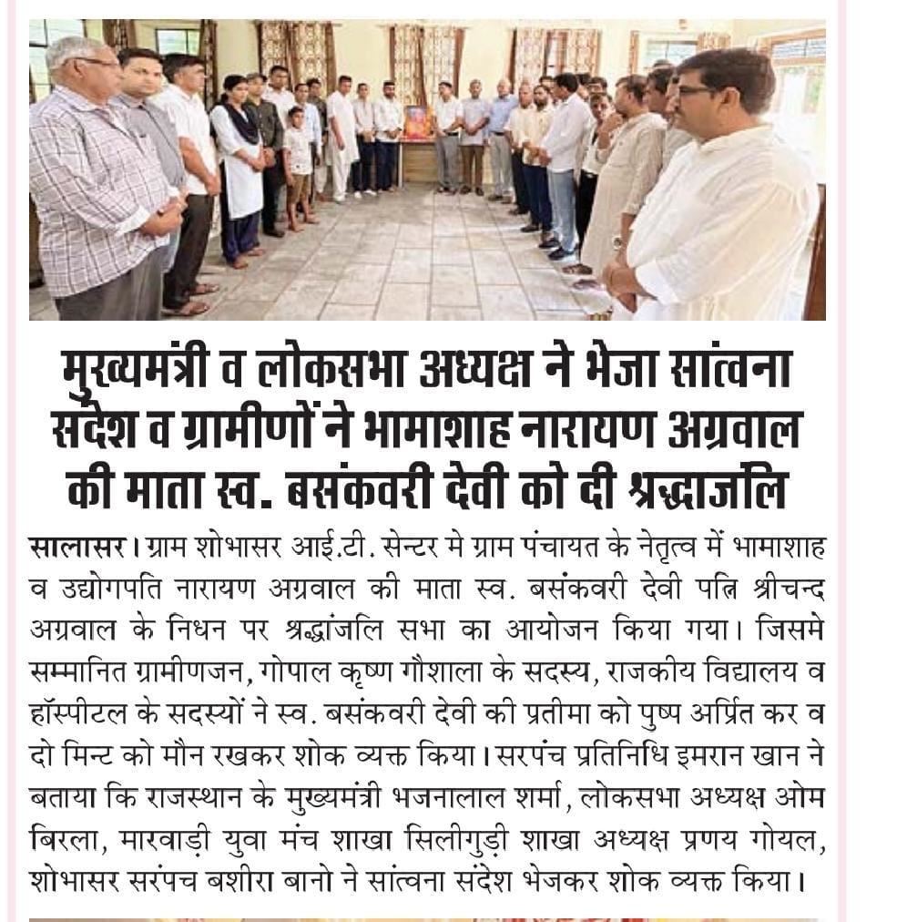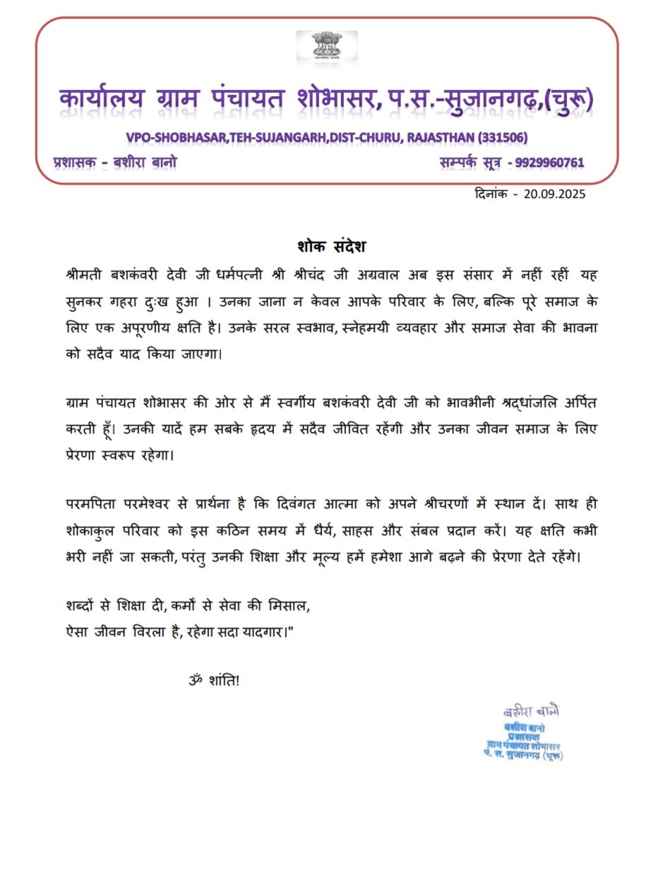 श्रीमती बसकंवरी देवी जी धर्मपत्नी श्री श्रीचन्द जी अग्रवाल अब इस संसार में नहीं रहीं यह सुनकर गहरा दुःख हुआ। उनका जाना न केवल आपके परिवार के लिए, बल्कि पूरे समाज के लिए एक अपूरणीय क्षति है। उनके सरल स्वभाव, स्नेहमयी व्यवहार और समाज सेवा की भावना को सदैव याद किया जाएगा। ग्राम पंचायत शोभासर की ओर से मैं स्वर्गीय बसकंवरी देवी जी को भावभीनी श्रद्धांजलि अर्पित करती हूँ। उनकी यादें हम सबके ह्दय में सदैव जीवित रहेंगी और उनका जीवन समाज के लिए प्ररेणा स्वरूप रहेगा। परमपिता परमेश्वर से प्रार्थना है कि दिवंगत आत्मा को अपने श्रीचरणों में स्थान दें। साथ ही शोकाकुल परिवार को इस कठिन समय में धैर्य, साहस और संबल प्रदान करें। यह क्षति कभी भरी नहीं जा सकती, परंतु उनकी शिक्षा और मूल्य हमें हमेशा आगे बढ़ने की प्रेरणा देते रहेंगे।