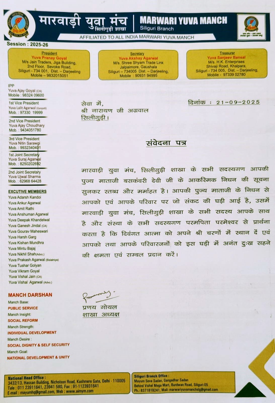 मारवाड़ी युवा मंच, सिलीगुड़ी शाखा के सभी सदस्यगण आपकी पुज्य माताजी बसकंवरी देवी जी के आकस्मिक निधन की सूचना सुनकर स्तब्ध और मर्माहत है। आपकी पुज्य माताजी के निधन से आपको एवं आपके परिवार पर जो संकट की घड़ी आई है, उसमें मारवाड़ी युवा मंच, सिलीगुड़ी शाखा के सभी सदस्य आपके साथ है और संस्था के सभी सदस्यगण परमपिता परमेश्वर से प्रार्थना करता है कि दिवंगत आत्मा को अपने श्री चरणों में स्थान दें एवं आपको तथा आपके परिवारजनों को इस घड़ी में अनंत दुःख सहने की क्षमता एवं सम्बल प्रदान करें।
